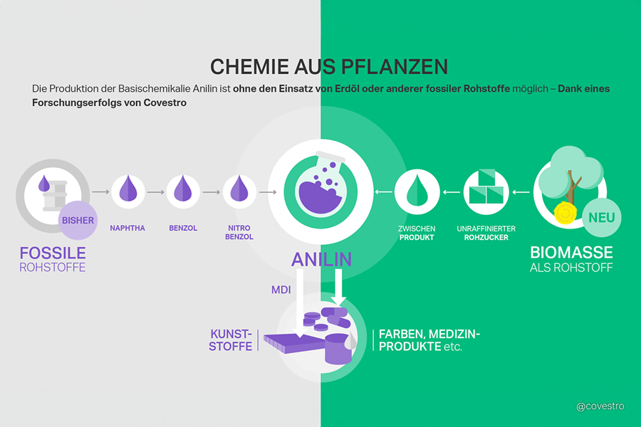 Covestro hat allerdings einen wichtigen Durchbruch erzielt. Bei der Synthese von Anilin hat das Unternehmen erstmals ein Verfahren entwickelt, bei dem beispielsweise Mais oder Stroh für die Produktion der Chemikalie eingesetzt werden können. So kann das biobasierte Anilin aus einhundert Prozent erneuerbarem Kohlenstoff bestehen. Eine Chance, den Einsatz fossiler Rohstoffe in den eigenen Anlagen zukünftig erheblich zu senken.