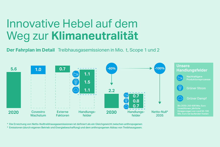 Covestro hat sich ehrgeizige Ziele gesetzt: Bis 2035 will das Unternehmen operativ klimaneutral sein – und damit seine Emissionen aus der eigenen Produktion (Scope 1) und aus zugekauften Energiequellen (Scope 2) auf netto Null gesenkt haben. Drei strategische Hebel sollen wesentlich zur Erreichung der Klimaziele beitragen: die nachhaltige Optimierung der eigenen Produktionsprozesse, die kontinuierliche Umstellung der Produktion auf Strom aus erneuerbaren Energien und die vermehrte Nutzung von grünem Dampf.
