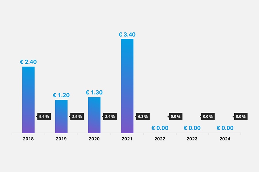 The dividend available for distribution is based on the distributable profit reported in the annual financial statements of Covestro AG, which were prepared according to the provisions of the German Commercial Code (HGB). Since the 2020 annual financial statements, Covestro AG’s dividend policy has been more closely linked to the Group’s overall business situation and specifies that Covestro AG will distribute a portion of the Group’s net income to shareholders of Covestro AG. Since the Group again generated negative net income in fiscal 2024, no dividend will be paid to Covestro AG shareholders for fiscal 2024, as for fiscal 2023, in accordance with the current dividend policy. Due to the negative net income in the year 2024, no dividend per share carrying dividend rights was paid for fiscal 2023.