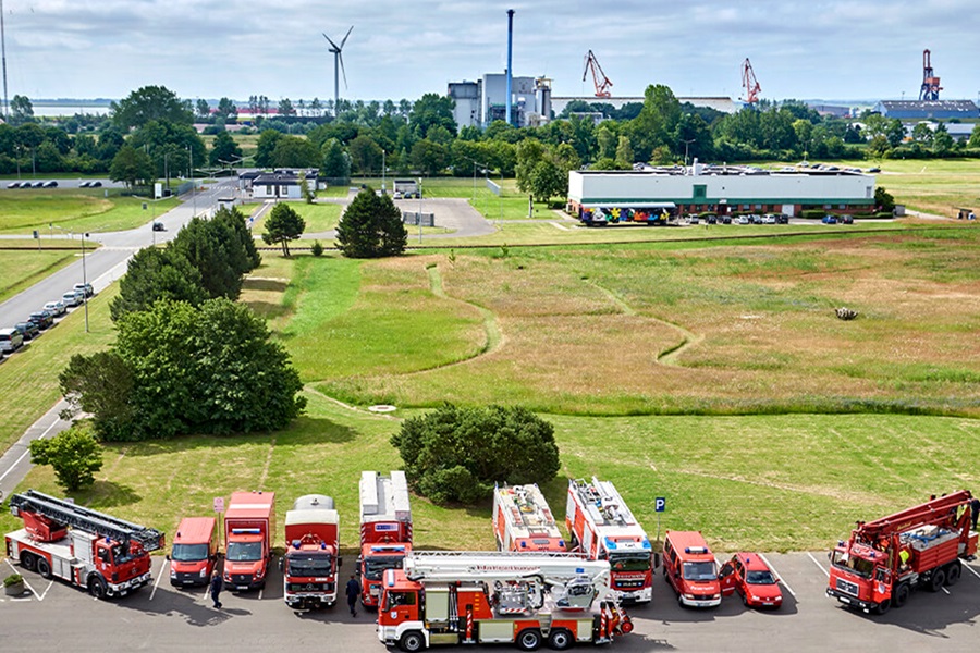 The industrial park fire department, which is specially equipped and trained to handle chemicals, plays an important role in the safety concept. More than 50 men and women work there in shifts 24 hours a day, 365 days a year. Their main task is preventive fire protection. Beyond that, the experts play a role in the planning of new buildings and train employees on how to act in emergency situations.