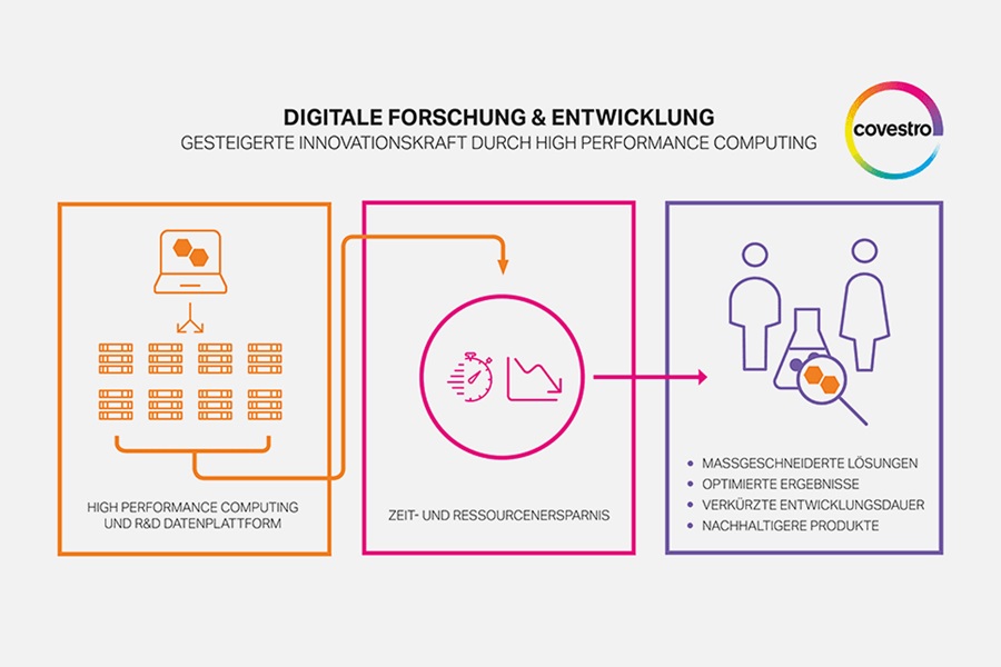 Covestro kooperiert bei dem Vorhaben mit etablierten IT-Unternehmen. So können künftig komplexe Forschungs- und Entwicklungsprozesse signifikant beschleunigt werden. Ein weiteres Plus: Versuchsreihen lassen sich mit deutlich höherem Umfang am Computer simulieren. Die Zeit bis zur Markteinführung bahnbrechender Innovationen verkürzt sich dadurch spürbar. Darüber hinaus wird der Gesamtprozess nachhaltiger, weil Energie- und Materialverbrauch in der experimentellen Arbeit sinken.