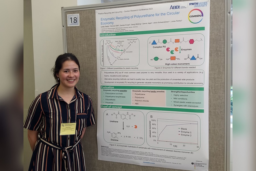 Um sich mit anderen Wissenschaftlerinnen und Wissenschaftlern auszutauschen und zu vernetzen, waren die drei Promovierenden der NEnzy-Gruppe in diesem Jahr auf drei wissenschaftlichen Konferenzen vertreten. Die Promovierenden der Nachwuchsgruppe, Daniela Knopp, Georg Röhling und Linda Pastor, nahmen jeweils an der 'Novel Enzymes 2023' in Greifswald (Deutschland), der 'BIOTRANS 2023' in La Rochelle (Frankreich) und der 'Plastics Recycling and Upcycling Gordon Research Conference (GRC) 2023' in Manchester (USA) teil.