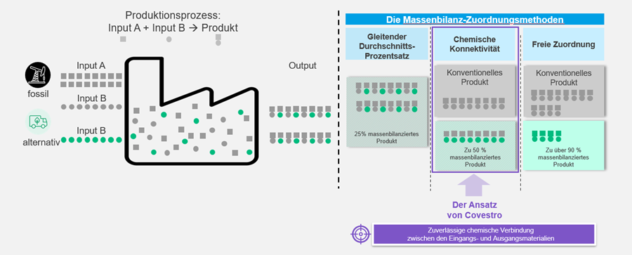 Die Massenbilanzlösungen von Covestro bieten den Kunden in wichtigen Regionen ein wesentliches Portfolio an erneuerbaren und recycelten zugeordneten Bausteinen. Diese transparent zugeordneten, mit ISCC Plus zertifizierten Rohstoffe ermöglichen es Akteuren in einer Vielzahl von Branchen, ihre eigenen leistungsstarken, nachhaltigeren Produkte in großem Maßstab zu erstellen und dabei ihre Umweltbilanz zu verbessern. Sie sind Teil der CQ-Materialien („circular intelligence“) von Covestro, die einen zugeordneten Anteil von mindestens 25 Prozent alternativen, nicht-fossilen Rohstoffen enthalten.