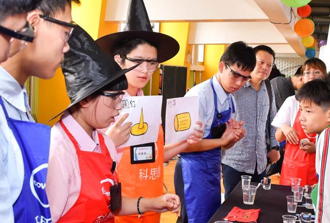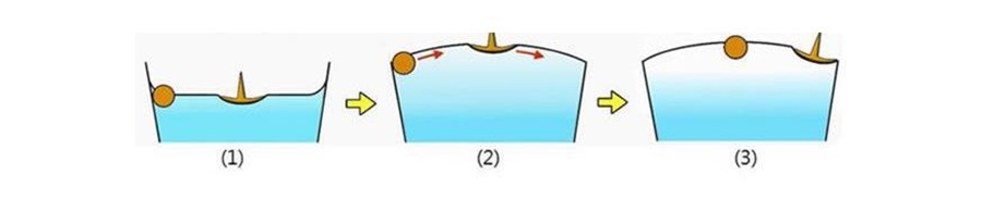 When you continue adding water to the glass cup, until it is full to the brim, the water surface will curve slightly upwards, as shown in diagram 2, due to the surface tension. As the center of the cup now has a higher water level, the chopstick will “rise” towards the center of the cup. Likewise, the thumb tack will “slide” towards the edge of the cup. As a result, the chopstick now stays at the center of the cup, while the thumb tack stays at the edge of the cup, as shown in diagram 3.*Resource come from: NTCU Science Game Lab.