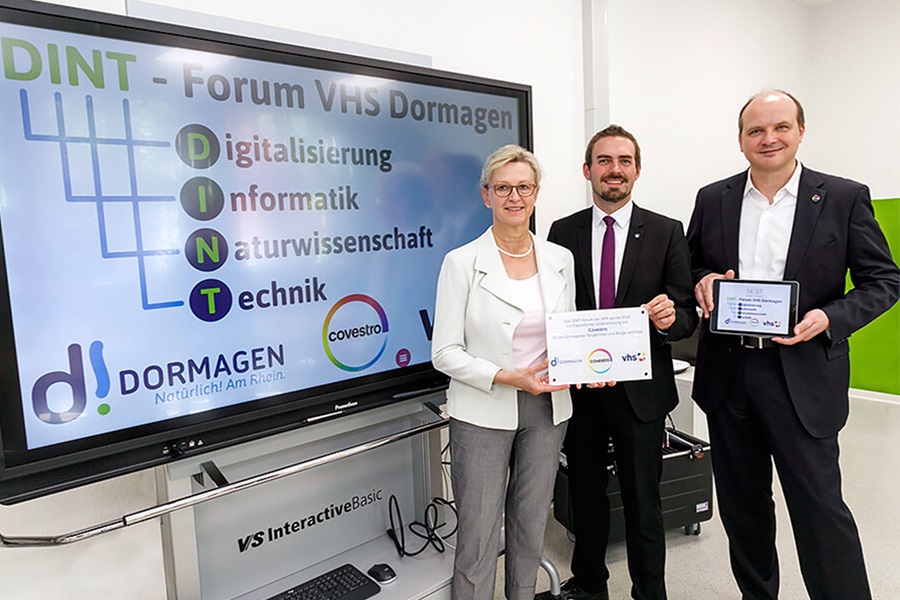 Covestro supported the construction of a central, alternative learning facility at the Volkshochschule Dormagen in 2018. The DINT Forum is designed to offer school children, trainees, companies and associations a multi-media learning environment. Guests can learn more about topics related to digitalization, computer sciences, natural sciences and technology.